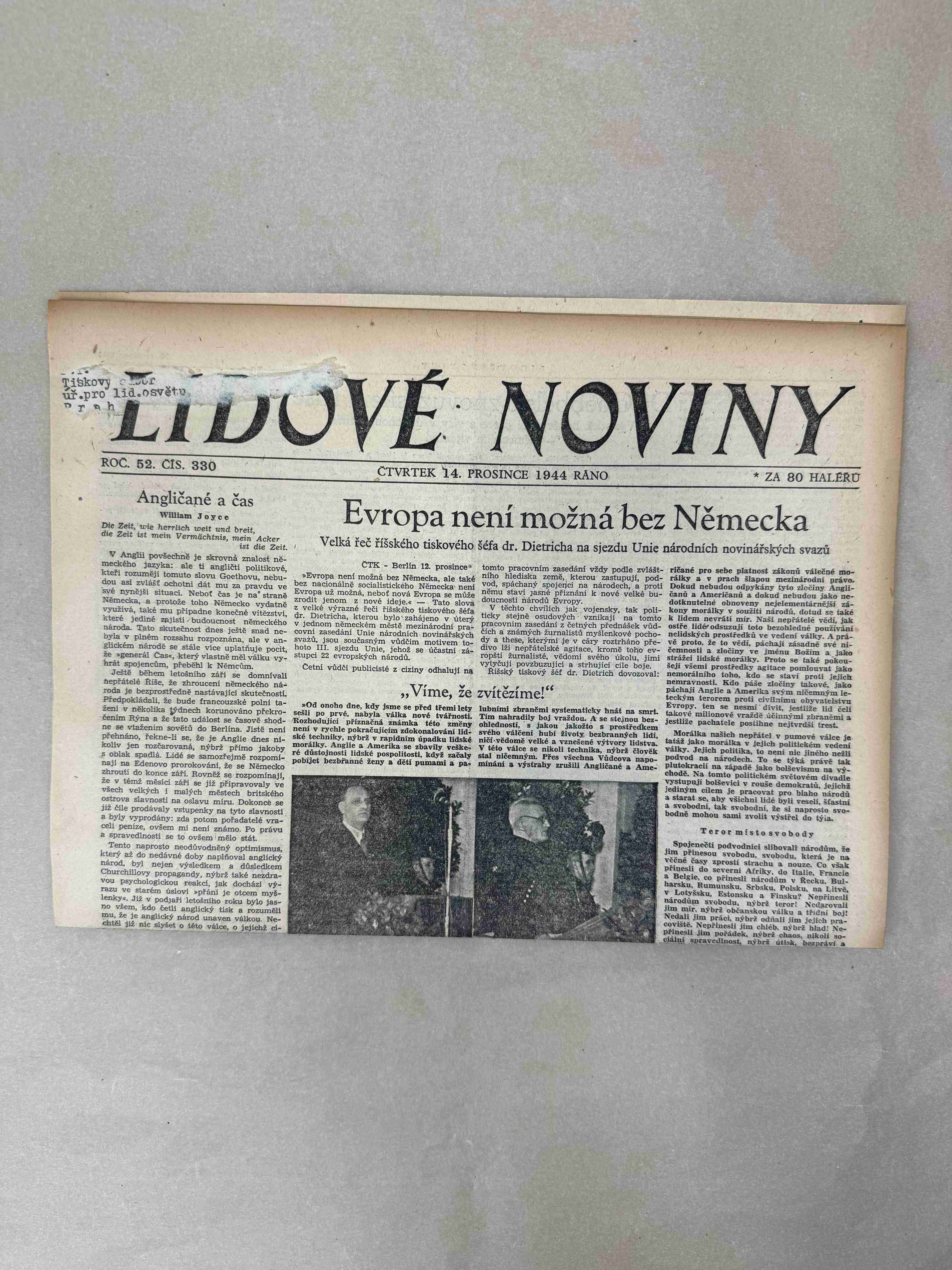 Originální dobový výtisk novin, nejedná se o reprodukci!