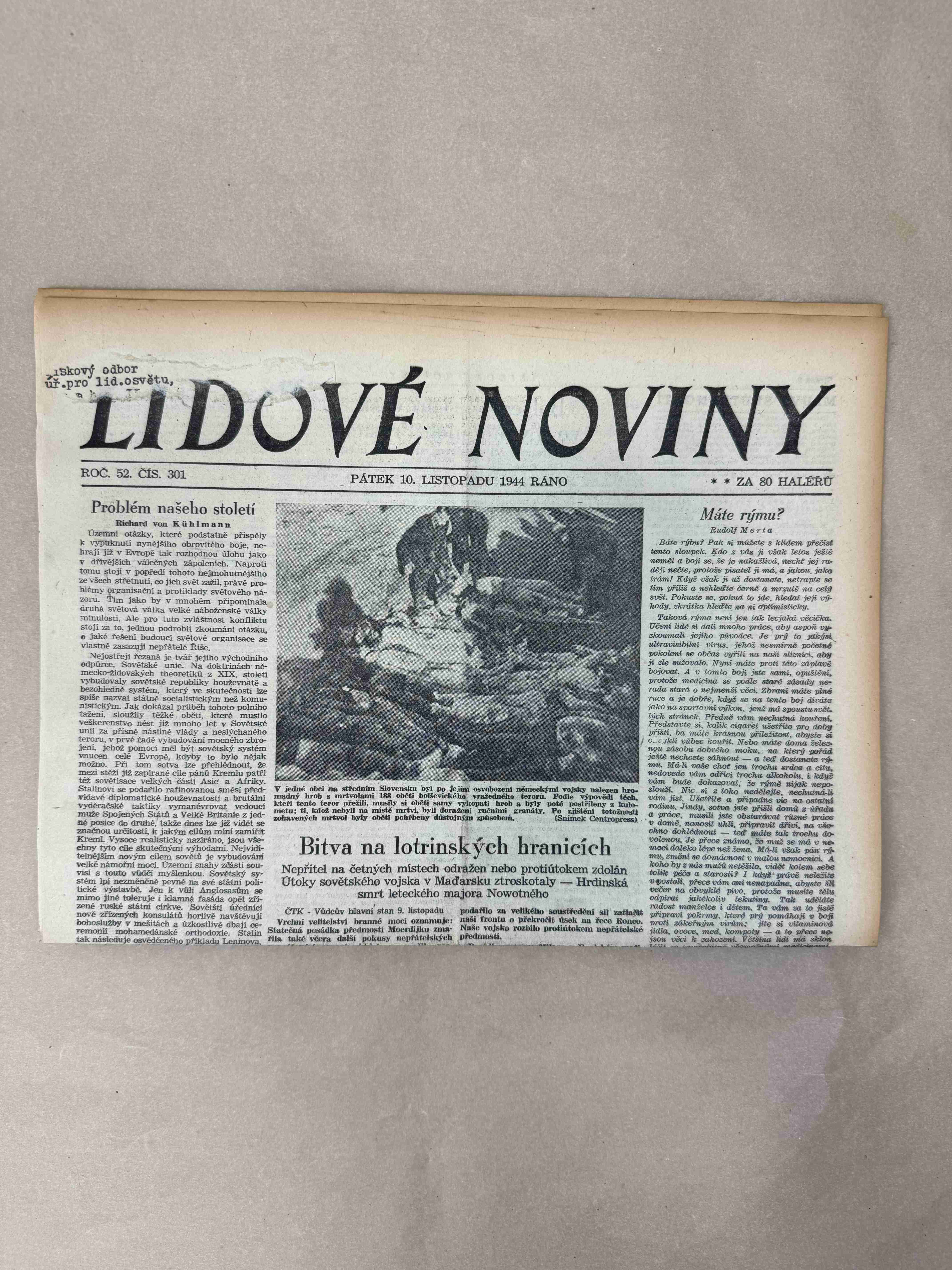 Originální dobový výtisk novin, nejedná se o reprodukci!