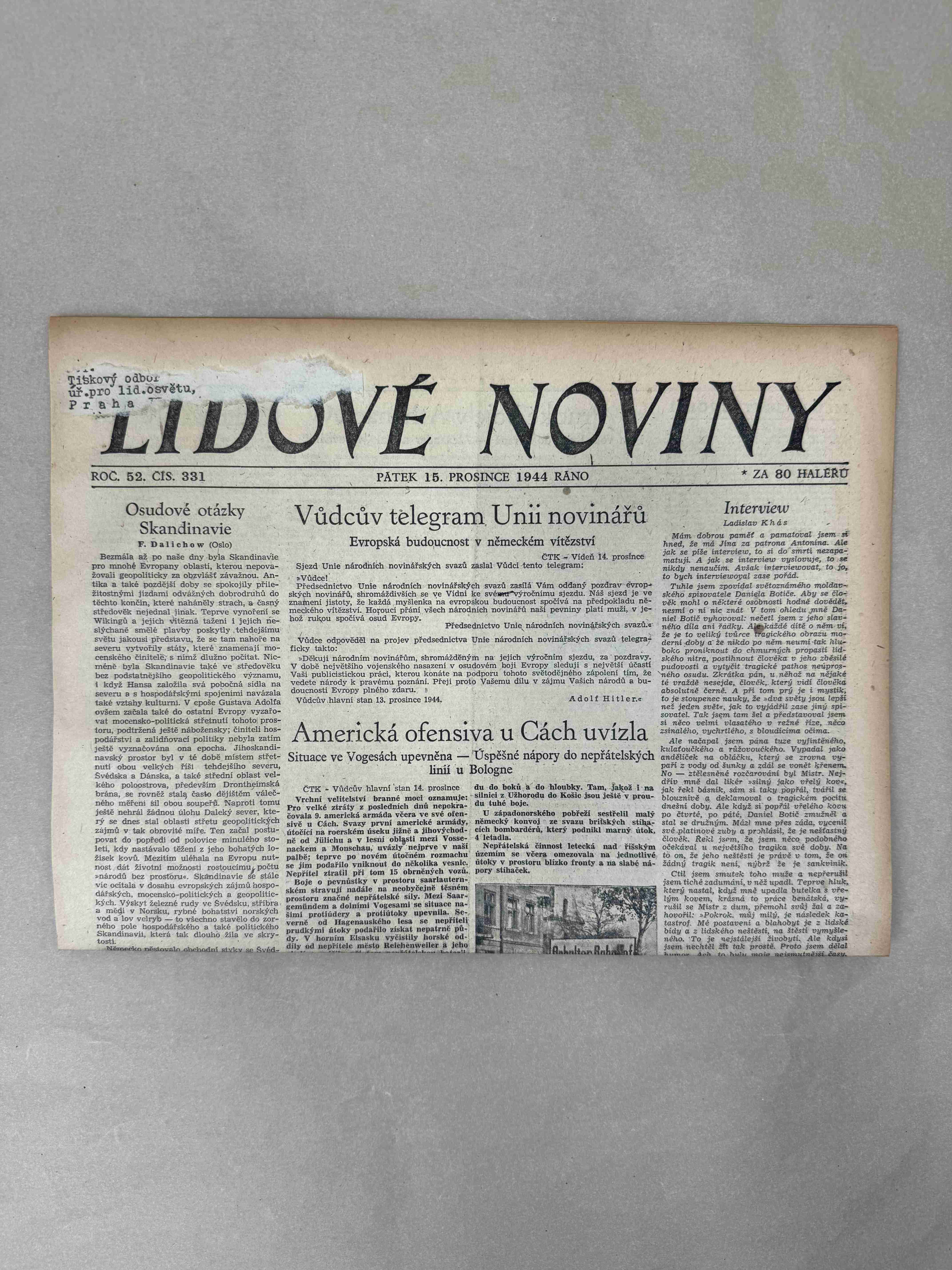 Originální dobový výtisk novin, nejedná se o reprodukci!