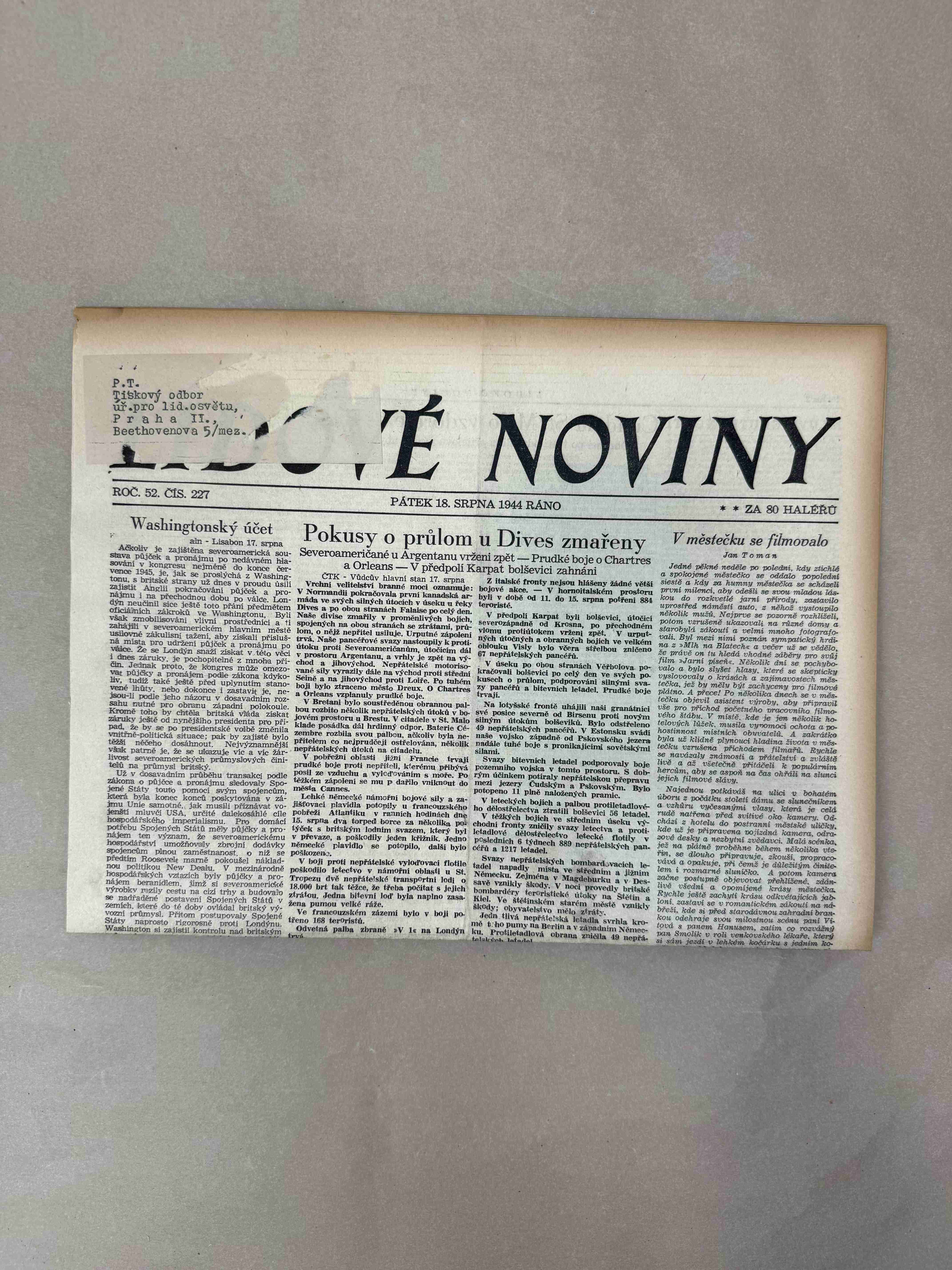 Originální dobový výtisk novin, nejedná se o reprodukci!