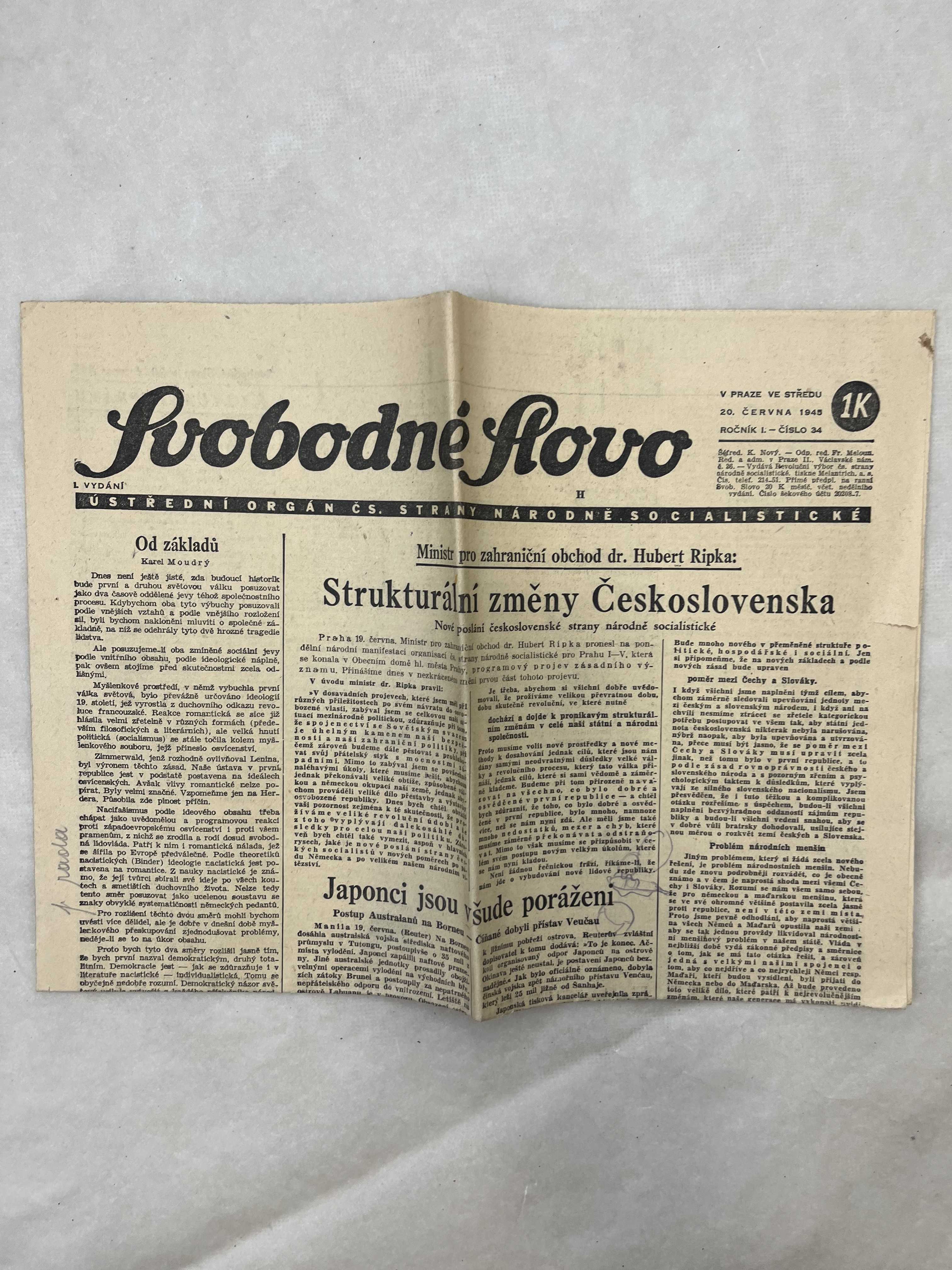 Originální dobový výtisk novin, nejedná se o reprodukci!