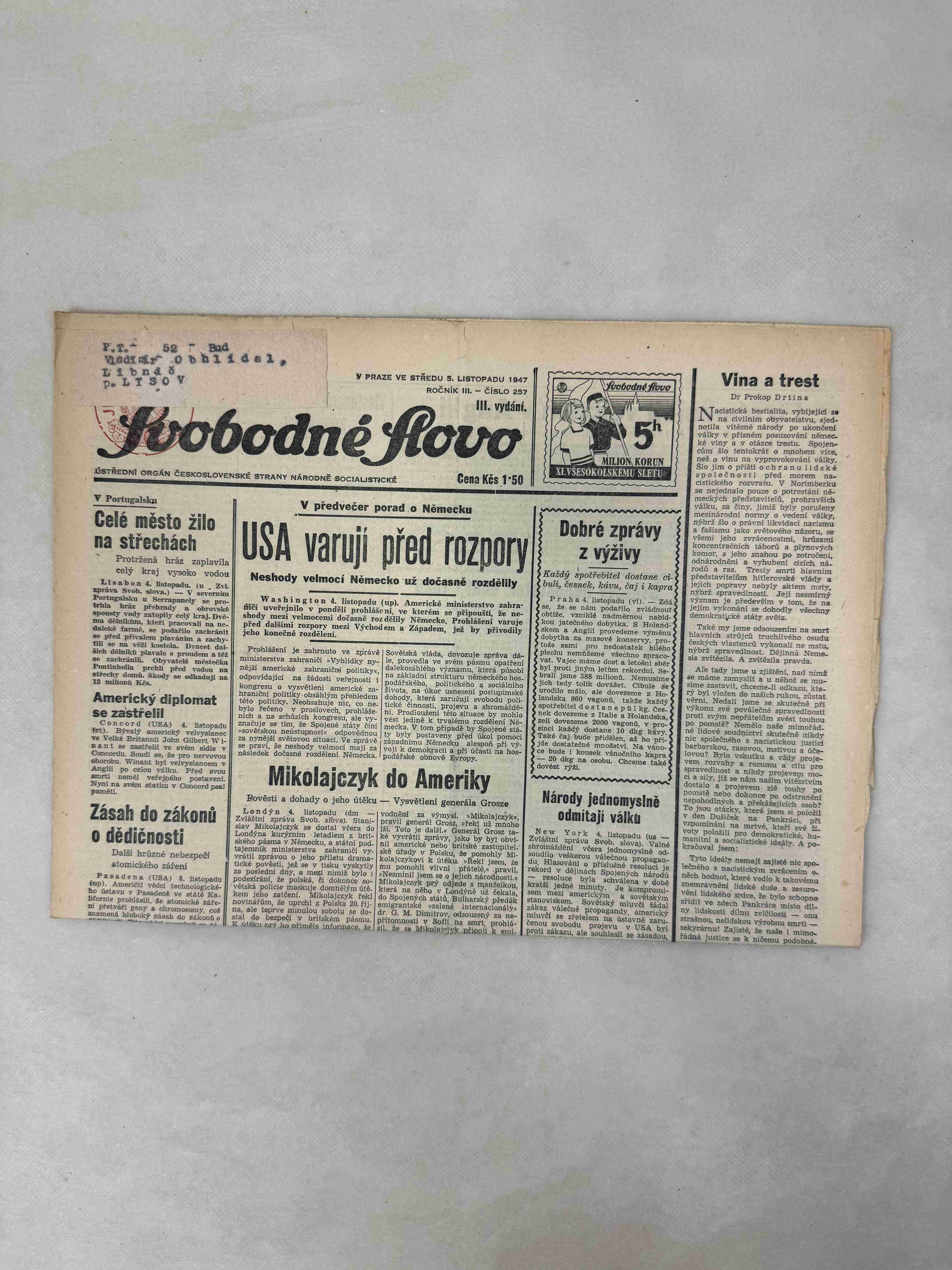 Originální dobový výtisk novin, nejedná se o reprodukci!