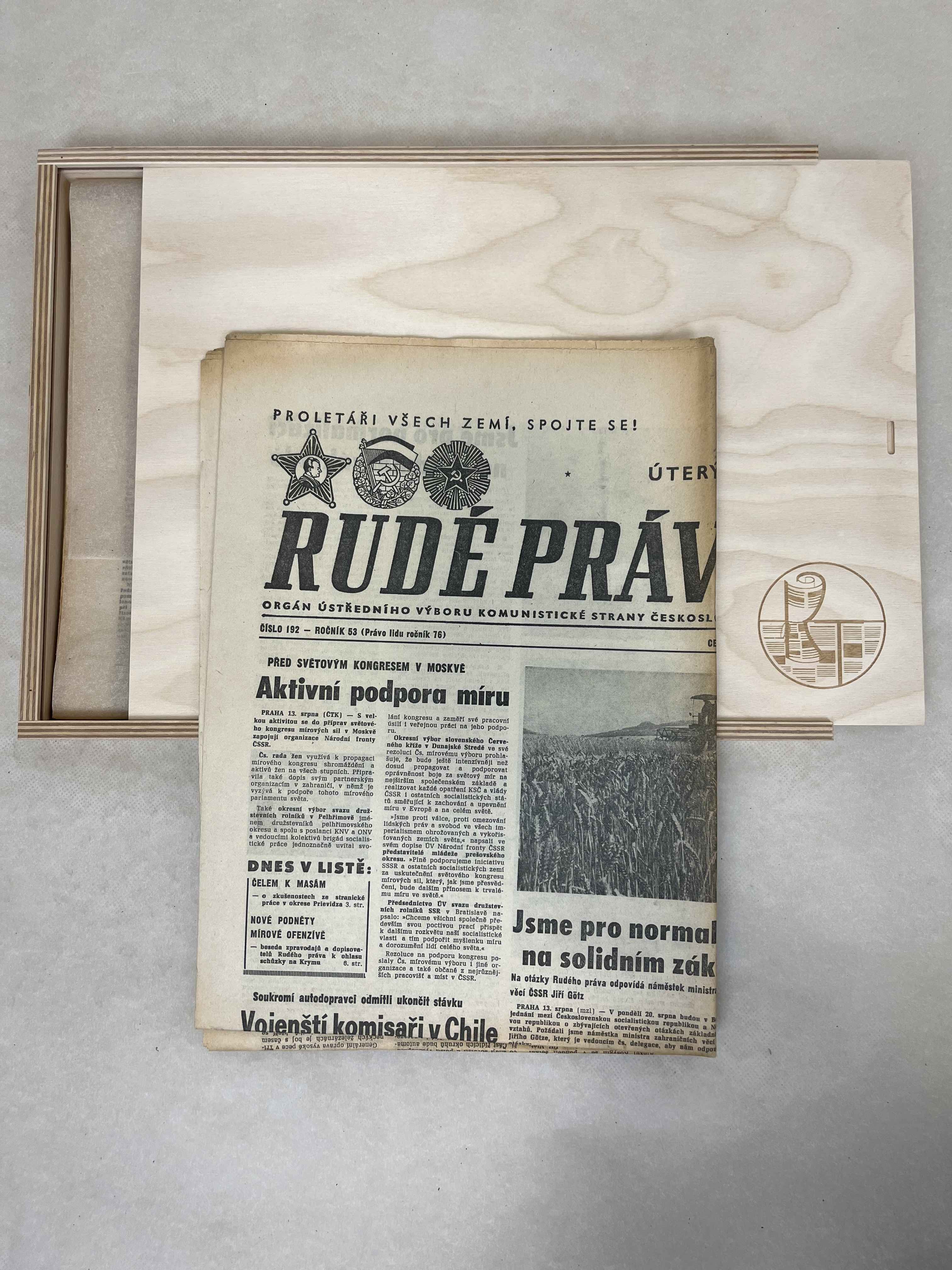 Nemusíte připlácet za lepší balení, protože každé noviny pro Vás balíme do luxusní dárkové dřevěné krabičky. Jediné za co si u nás můžete připlatit, je možnost gravírování vlastního textu na krabičku.